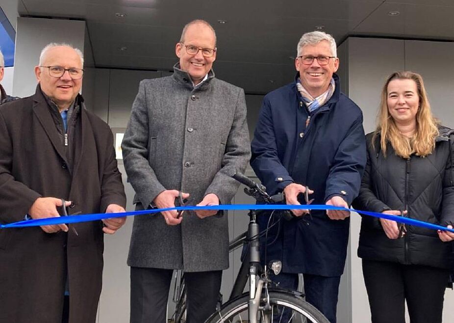 Eröffnen gemeinsam den Fahrradturm: Ortsbürgermeister Thomas Silbermann (v.l.), Ulf-Birger Franz, Verkehrsdezernent der Region Hannover, Wunstorfs Bürgermeister Carsten Piellusch und Projektleiterin Franziska Reitz.